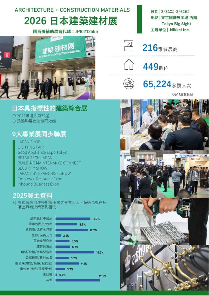 | 2026日本建築建材展 | 東京國際展示場 西館 | 2026/3/3~3/6 | *標攤: 9平米 / NT214,000 元(含稅、基裝)、兩攤以上。 | Full Details → | |