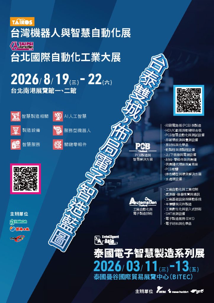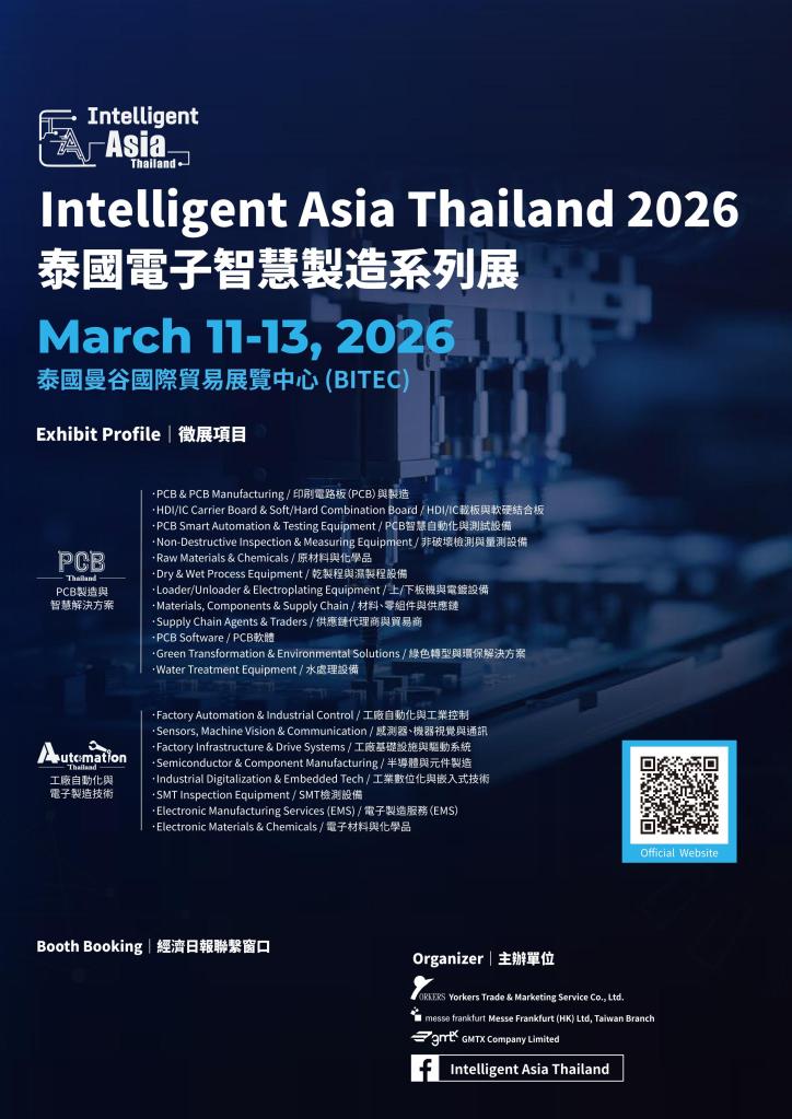 | 2026泰國電子智慧製造系列展 | 泰國曼谷國際貿易展覽中心(BITEC) | 2026/3/11~3/13 | *淨地: 每攤USD3,240,需另含5%稅 *標攤: 每攤USD3,600,需另含5%稅 | Full Details → |