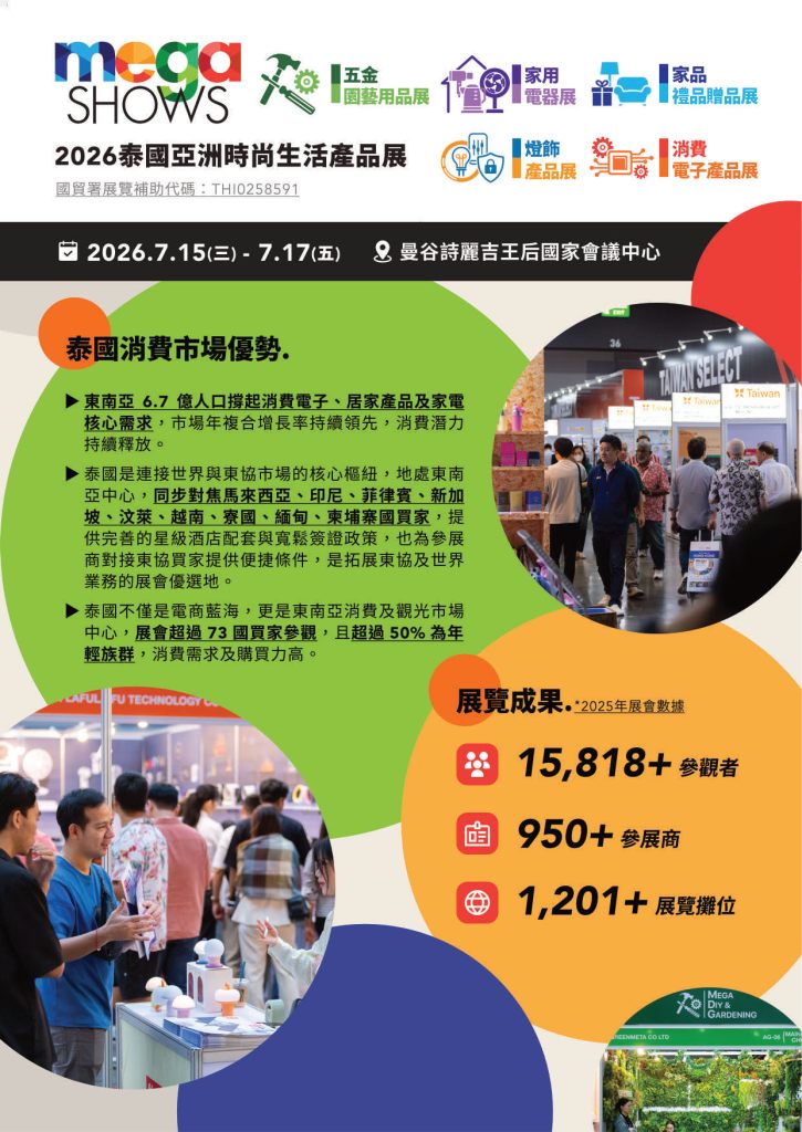 | 【2026泰國Mega Show】燈飾產品展、消費電子展、五金及園藝用品展 | QSNCC ( 曼谷詩麗吉皇后國家會議中心 | 2026/7/15(三) -7/17/(五) | ●攤位費用: 136,500元 NTD/含稅 (9平方米) ● 預備金: 10,000元 NTD (9平方米);電費、雜支展後多退少補 | Full Details → | |