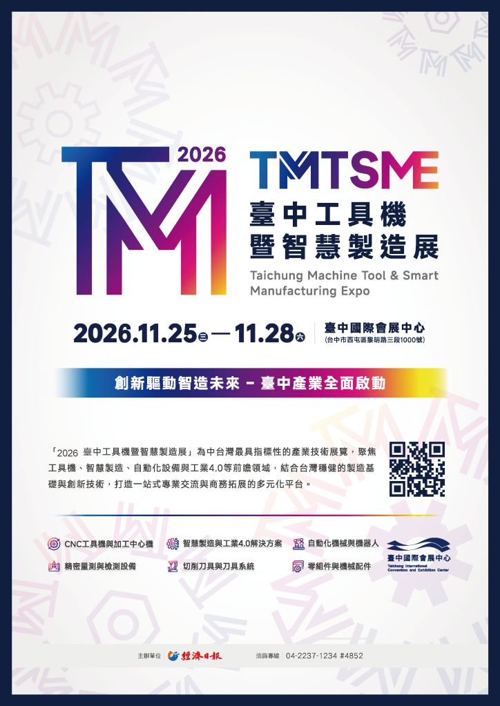 | 2026台中工具機暨智慧製造展 | 臺中國際會展中心(水湳經貿園區) | 2026/11/25~11/28 | 標攤47,250元 | 標攤42,000元 | Full Details→ |