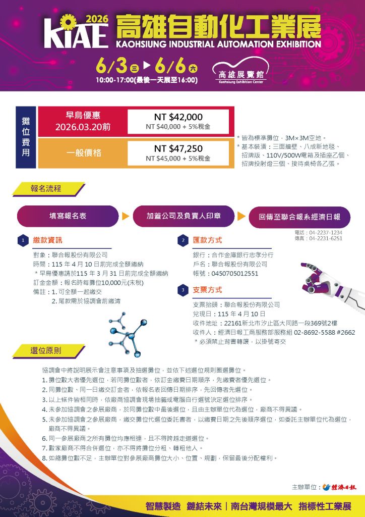 | 2026高雄自動化工業展 | 高雄展覽館 | 2026/6/3~6/6 | 標攤45,000元 | 早鳥40,000元 原價45,000元 | Full Details → |