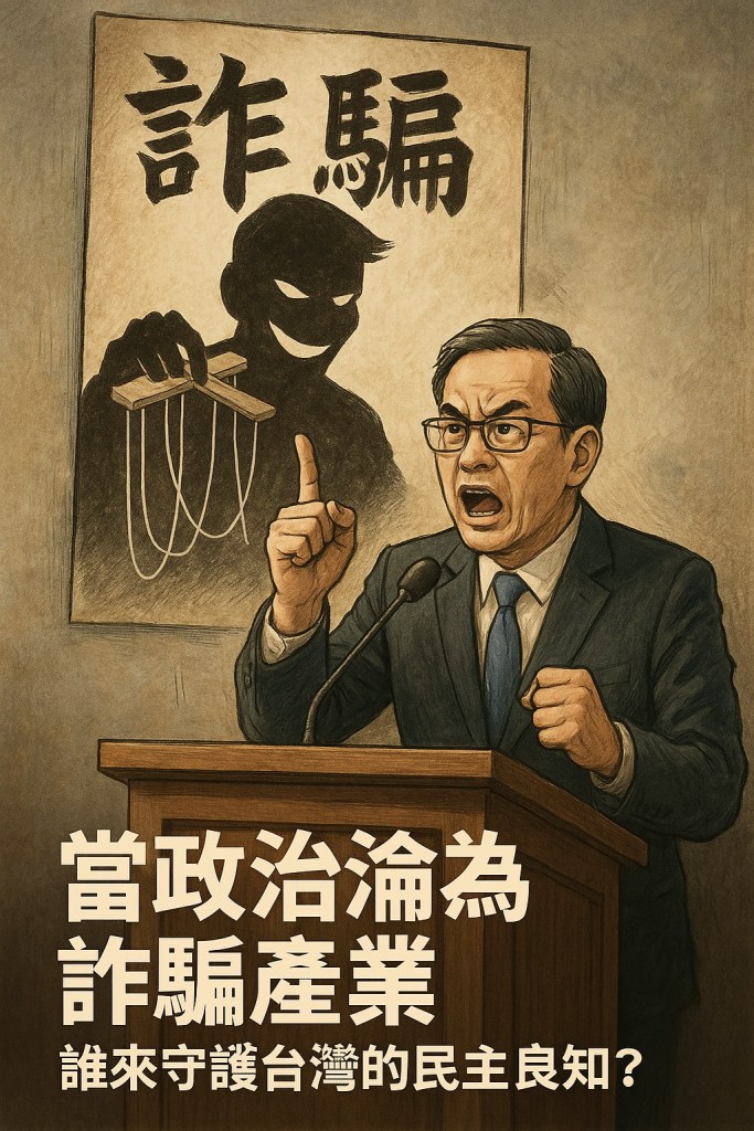 台灣政治現場如今儼然成為一個高明的「詐騙工廠」,披著選賢與能的外衣,實則不斷上演「騙權、騙錢、騙感情」的連環劇。人民在選票裡寄望改革與希望,卻在選後驚覺承諾早已淪為泡影。當初高喊透明政治、司法獨立的政客,現今卻悄悄推動鞏固權力的法案,企圖削弱監督機制,否決反對聲音,不讓議會與人民對其問責。