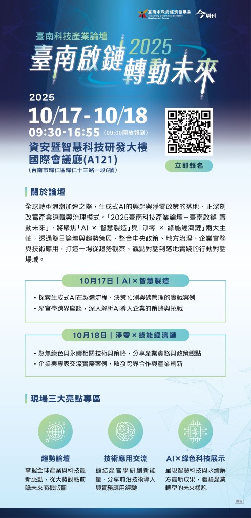 「2025臺南科技產業論壇—臺南啟鏈 轉動未來」將於10月17日(五)與18日(六)上午9時30分至下午4時55分,在資安暨智慧科技研發大樓國際會議廳A121(臺南市歸仁區歸仁十三路一段6號)登場。活動免費參加,線上報名網址:https://events.businesstoday.com.tw/2025/TainanTechnology/。